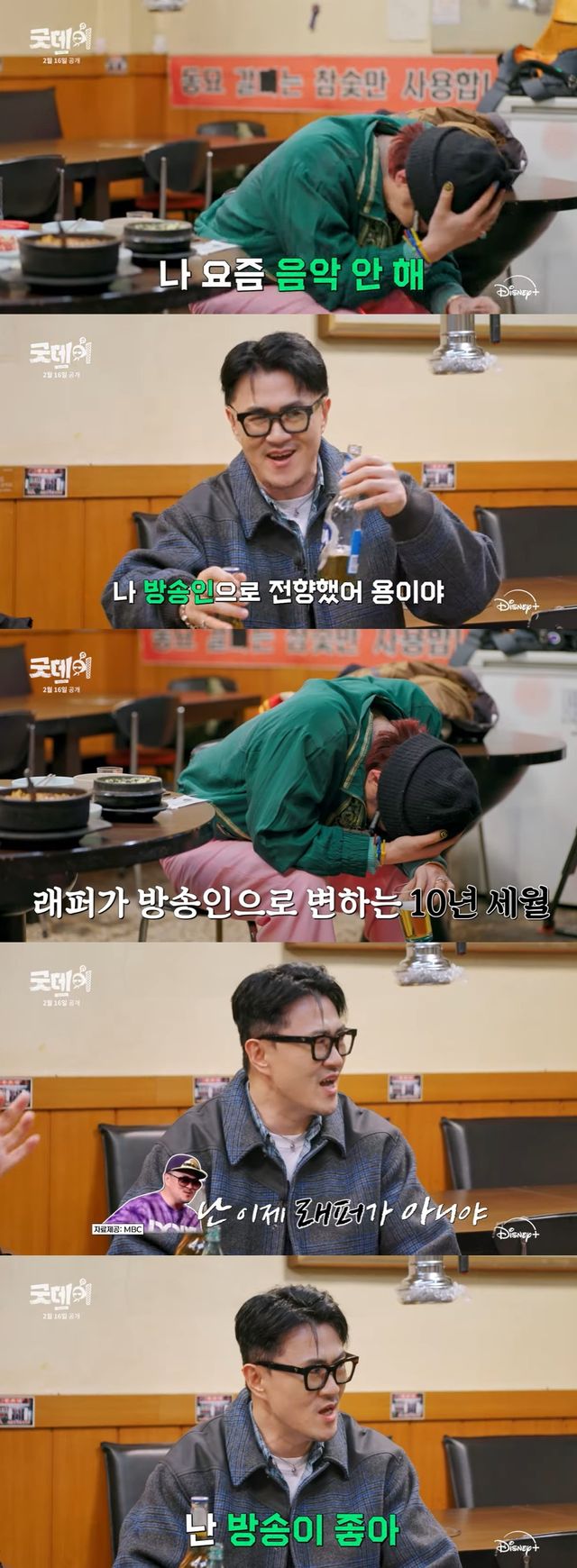 "내일모레 50인데 아직도 성장하면 어쩌냐"는 정형돈의 일침에 데프콘은 "나 요즘 음악 안 한다. 나 방송인으로 전향했다"고 폭탄 발언을 했다.
