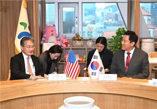 연합뉴스에 따르면 오세훈 서울시장이 6일 서울시청에서 조셉 윤 주한 미국 대사대리를 만나 대화하고 있다. 2025.2.6 [서울시 제공. 재판매 및 DB 금지]