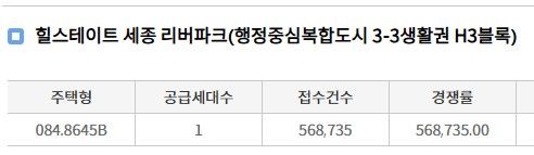연합뉴스에 따르면 6일 한국부동산원 청약홈에 따르면 세종시 소담동에 공급되는 '힐스테이트 세종리버파크'(행정중심복합도시 3-3생활권 H3블록) 84㎡ 타입 무순위 1가구 모집에 56만8천735명이 신청했다.