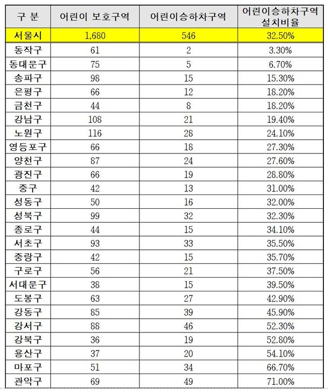 [투어코리아=유경훈 기자] 서울시가 어린이들의 안전한 승하차를 보장하고 불법 주정차로 인한 사고를 예방하기 위해 추진한 ‘어린이 안심승하차구역’ 설치율이 전체 어린이 보호구역의 33%에 그친 것으로 나타났다. 특히 동작구는 3%에 그쳐 서울시 자치구 가운데 최저를 기록했다,