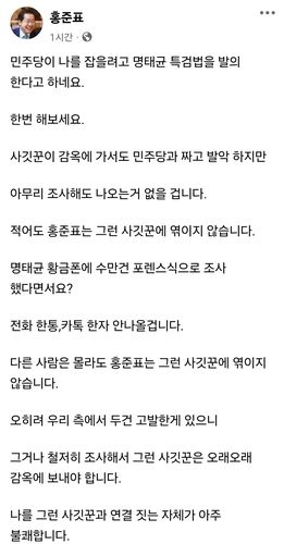 홍 시장은 이날 페이스북 글에서 "더불어민주당이 나를 잡으려고 명태균 특검법을 발의한다고 한다"라며 이같이 밝혔다.
