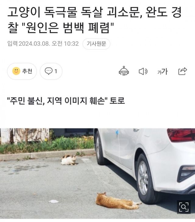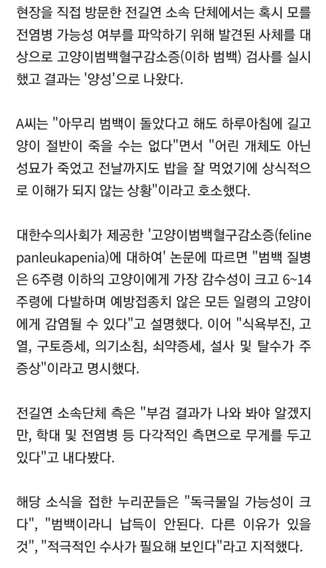 범백이라는 전염병으로 죽은거임 사료 뿌려서 수십마리 모이게 만든 캣맘이 문제다