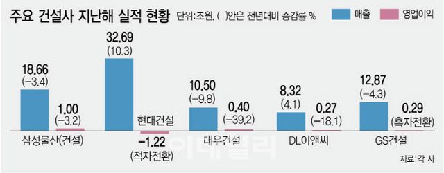 다른 건설사들의 분위기도 다르지 않다. 지난달 22일 실적을 발표한 현대건설은 지난해 무려 1조 2209억원의 영업손실을 기록한 마당이다. 같은 기간 매출은 10.3% 증가한 32조 6944억원으로 집계됐다. 녹록지 않은 국내 경영환경에 더해 연결 자회사인 현대엔지니어링의 해외 플랜트 사업에서 대규모 일회성 비용이 발생한 데 따른 것이다.