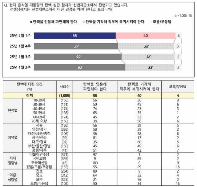 윤석열 대통령의 탄핵 심판에 대해 헌법재판소가 '탄핵을 인용해 파면해야 한다'는 여론이 55%로 나타났다. '탄핵을 기각해 직무에 복귀시켜야 한다'(40%)는 응답보다 15%포인트(P) 높은 수치다.