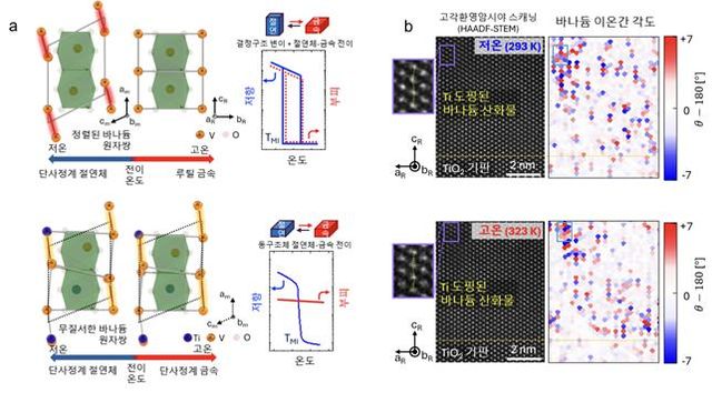 연구팀은 바나듐 산화물 상전이 신소재(이하 VO2) 내 타이타늄(이하 Ti) 이온 도핑을 통해 규칙적 결정구조의 질서를 교란, 상전이 시 발생하는 부피 변화 제거에 성공했다.