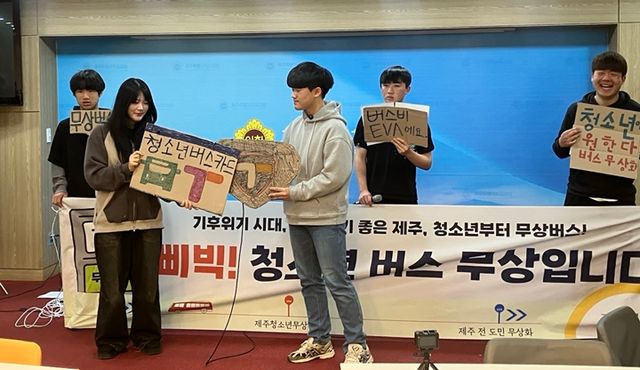 청소년기후평화행동 행동팀은 7일 제주도의회 도민카페에서 기자회견을 열고 "어린이와 청소년의 버스비 무상지원은 경제적 부담을 줄이고 제주도의 자가용 의존도를 낮춰 대중교통을 활성화시키는 중요한 정책"이라면서 "어린이와 청소년들이 경제적 부담없이 편리하게 이동할 수 있도록 도와주길 바란다"고 말했다.