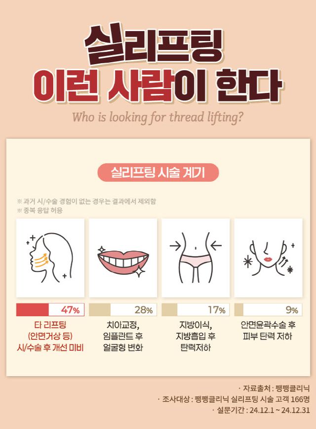 팽팽의원(팽팽클리닉)은 지난 2024년 12월 1일~31일 방문 고객 166명을 대상으로 실시한 ‘실리프팅 시술 이유’에 대한 설문조사 결과를 7일 공개했다.