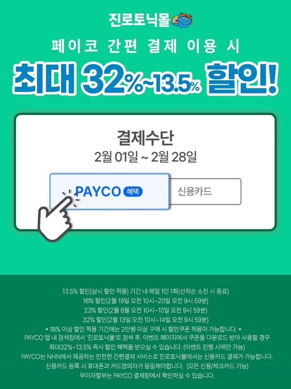 이번 이벤트는 자사의 대표 제품인 진로토닉워터, 블랙보리, 하이트제로0.00을 대상으로 진행되며, 간편 결제 서비스 '페이코'를 이용해 구매할 시 혜택이 적용된다. 8일부터 10일 오전 10시까지는 주말 쿠폰을 통해 최대 23% 할인가로 판매된다.
