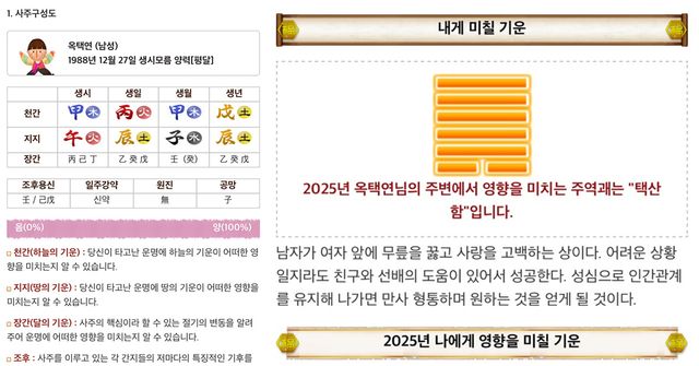 한편, 옥택연은 2020년 4살 연하의 비연예인 여자친구와의 열애를 인정했으며 4년째 공개 연애 중이다. 해당 헤프닝 후 일각에서는 옥택연이 현재 여자친구와올해 결혼을 할 수 있을지 주목되고 있는 가운데, 그의 사주를 통해 알아보았다.
