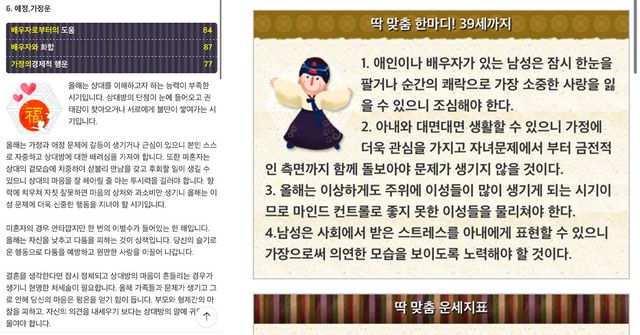 이외에도 '냉정하고 솔직한 쪽집게 감정', '후련한 토정비결', '출사표 비책', '타로 예지', '핵심 분석' 등 재미있게 점칠 수 있는 다양한 신년운세 서비스가 준비되어 있다.