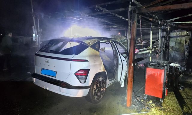 7일 0시께 충북 제천시 봉양읍의 한 주택에 주차했던 코나EV 전기자동차에서 불이 나 3100여만원의 재산피해를 내고 20여분만에 진화됐다. (사진=제천소방서 제공)2025.02.07. 제천=뉴시스