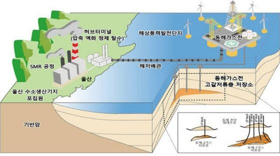 ▲ 한국석유공사 동해가스전을 활용한 이산화탄소 포집·저장(CCS) 통합실증사업 개념도 (자료=산업통상자원부) |