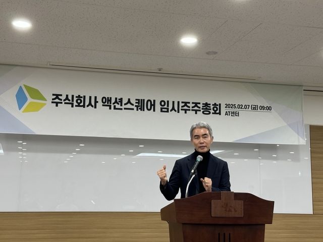 장현국 넥써스(옛 액션스퀘어) 대표가 임시 주주총회에서 발언하고 있다. 사진=강준혁 기자
