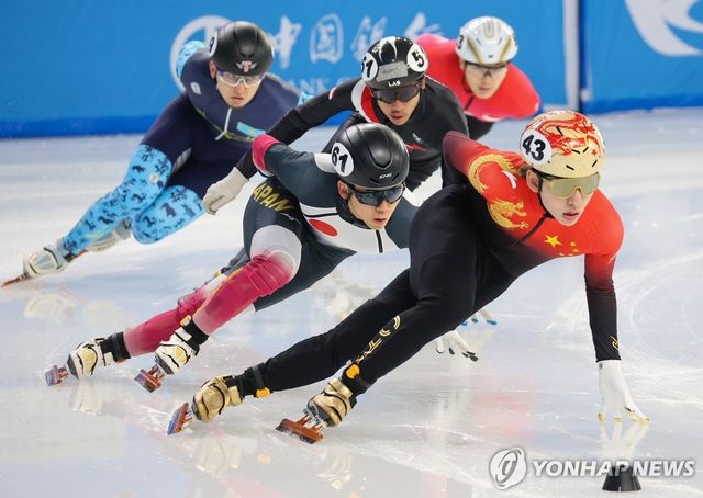 7일 중국 하얼빈 헤이룽장 빙상훈련센터 다목적홀에서 열린 쇼트트랙 남자 1,500m 준준결승에서 중국 린샤오쥔(43번)이 질주하고 있다. / 연합뉴스