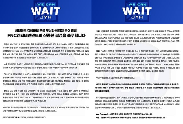 정용화는 공식 트위터를 통해 "늘 고맙고 사랑합니다"라며 장문의 글을 남기기도 했다. 그는 "팬들을 빨리 만나고 싶은 마음에 욕심을 내봤지만, 의료진과 상의한 결과 4월부터는 큰 무리가 없을 것으로 판단되어 공연을 이어갈 계획이다. 물론 당장 전 '에바뛰'를 못할 수도 있지만, 많은 보이스분들이 그 어느때보다 힘차게 뛰어주실 것이라고 믿는다"라고 말했다.