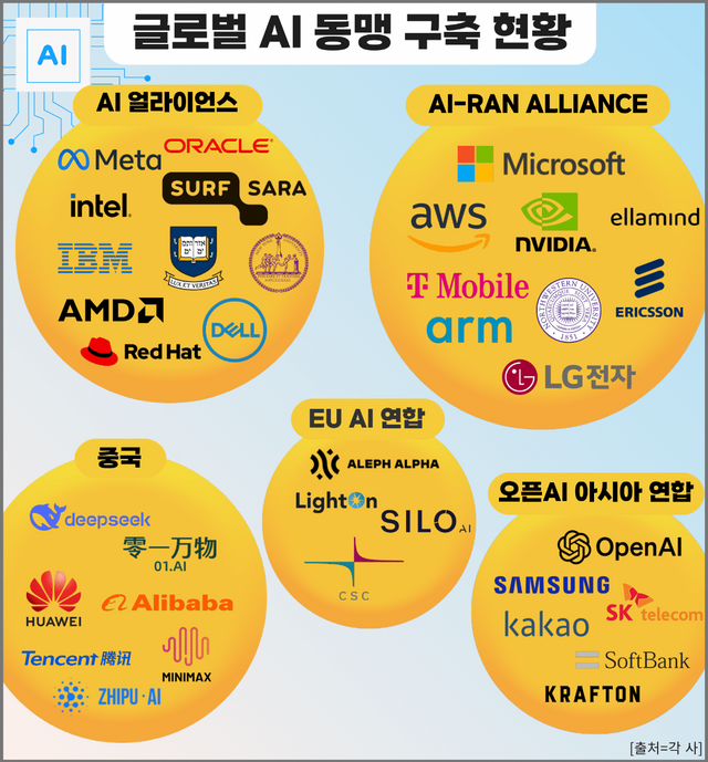 미국의 또 다른 AI 동맹으로는 'AI-RAN 얼라이언스'가 있다. 마이크로소프트가 동맹을 주도하고 있으며 대표적 멤버로는 △아마존 웹서비스 △T모바일 △엔비디아 △LG전자 △노키아 △에릭슨 등이 있다. 'AI-RAN 얼라이언스'는 AI와 무선통신 기술 융합을 목표로 하고 있다. 통신기술을 토대로 인프라 구축 및 에너지 효율을 극대화해 실용적 AI 생태계를 만드는 것에 집중한다.