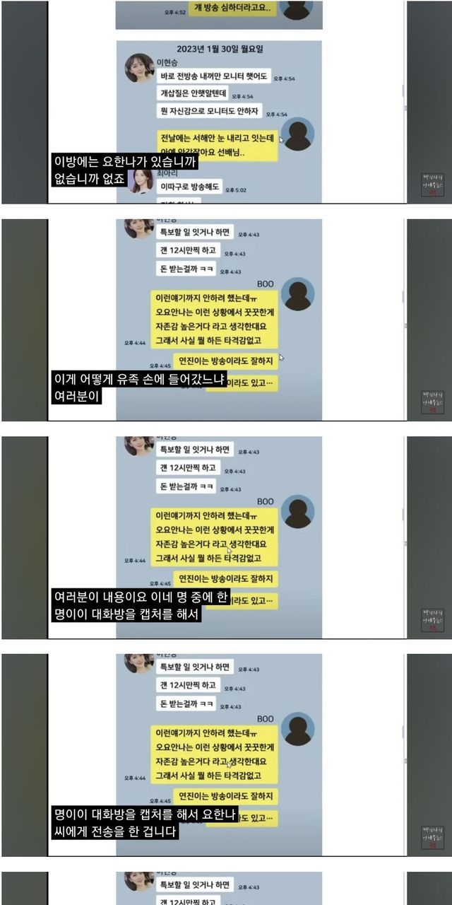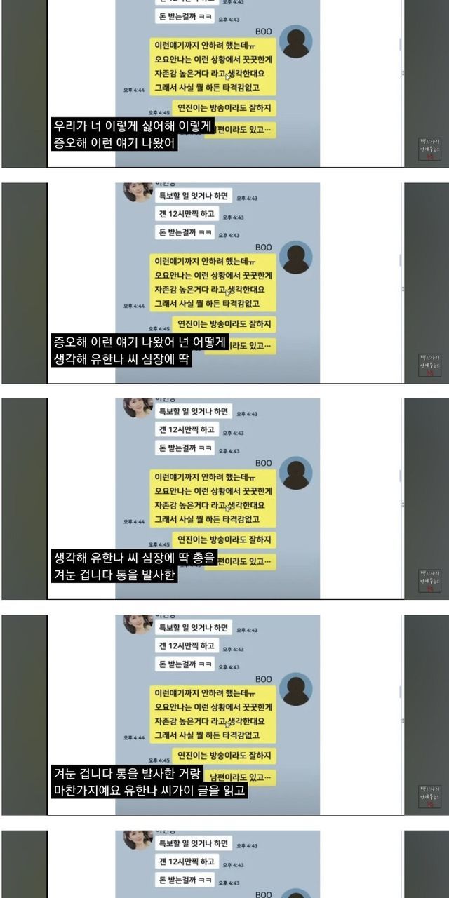 저 단톡방 중 누군가 1명이, 오요안나가 살아있을 때 괴롭힘 용도로 저 방을 캡쳐해서 고인에게 보냈던 톡인데 흔적이 아직도 남아있었던 거