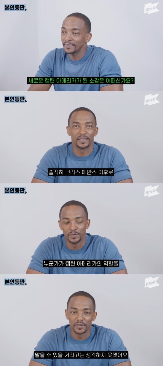 자신이 맡은 샘 윌슨이 새로운 캡틴 아메리카로 등극한 것에 대한 소감을 묻자 앤서니 맥키는 "정말 신닌다. 솔직히 크리스 에반스를 대신해서 누군가가 캡틴 아메리카의 역할을 맡을 수 있을 거라고 생각하지 못했다. 그는 최고의 캡틴 아메리카였기 때문"이라고 운을 뗐다.