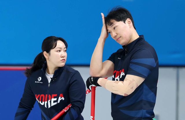 6일(현지시간) 중국 헤이룽장성 하얼빈시 핑팡컬링아레나에서 열린 하얼빈 동계아시안게임 컬링 혼성 믹스더블 B조 대한민국과 중국의 경기에서 성지훈이 투구 실수한 뒤 아쉬워하고 있다. / 뉴스1