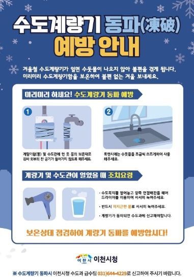 이천시에서는 수도시설의 동파 피해를 줄이기 위해 이장단을 통해 수도계량기 동파를 사전에 대비하도록 적극 당부했고 시민들 또한 각 가정에서 수도계량기 방한을 강화하고 온수를 약하게 틀어 놓거나 보일러를 끄지 않도록 하는 등 자발적인 동파 예방 행동 요령을 실천하도록 강조했다.