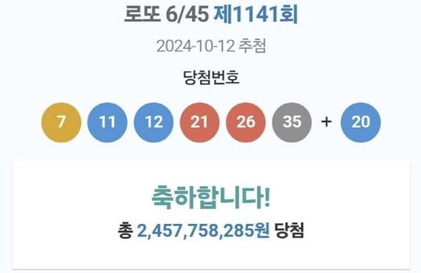 A씨가 공개한 사진에는 지난해 10월 12일 추첨한 로또 제1141회 1등에 당첨된 내역이 적혀 있었다. 당첨 번호는 ‘7·11·12·21·26·35’이며 보너스 번호는 ‘20’이다. 해당 회차에 당첨 번호 6개를 모두 맞힌 1등은 총 11명으로 각각 24억 5775만 8285원을 받는 것으로 알려졌다.