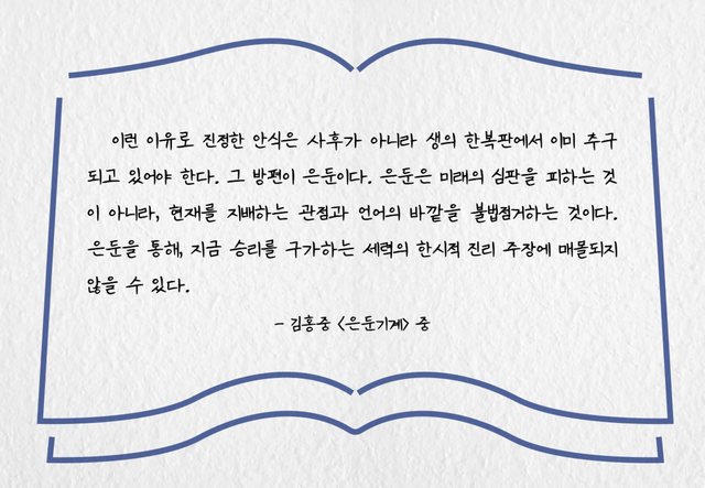 리버스에서는 책 『은둔기계』와 영화 <김씨표류기> 를 통해 '은둔'을 둘러싼 다양한 시각과 관점을 탐구할 수 있었다. <김씨표류기> 에서 두 은둔자가 서로를 이해하듯, 우리 사회도 고립되고 은둔한 청년들을 더욱 포용력 있는 시선으로 바라볼 필요가 있지 않을까. 김씨표류기> 김씨표류기>