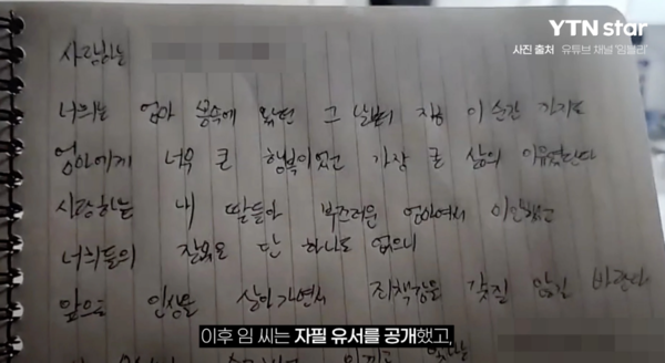 그녀는 유서에서 두 딸에게 "엄마는 너희를 세상에서 가장 사랑했다"며 "부끄러운 엄마여서 미안하다"고 적었으며, 전 남편에게는 "아이들을 부탁한다"는 메시지를 남겼다.