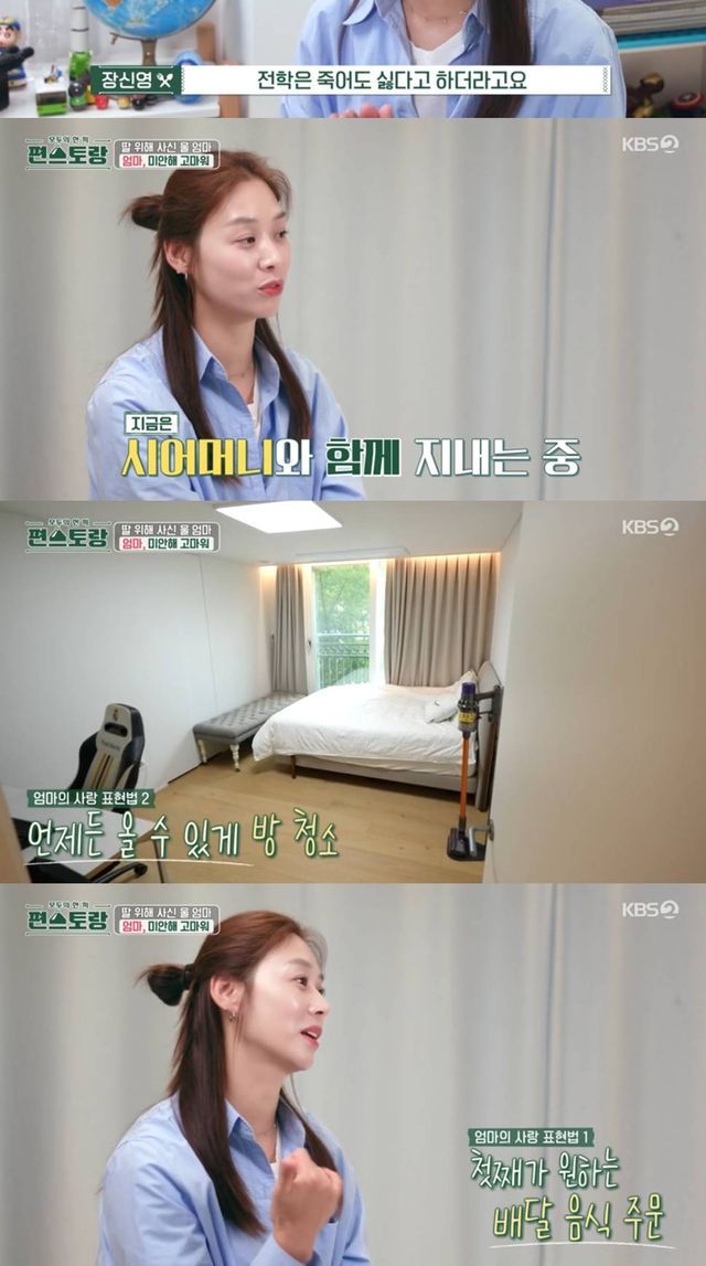 장신영은 "할머니가 잘해주시지만 그런 게먹고 싶을 때가 있지 않냐. 그러니까 배달 시켜서 해달라 하면 해주고. 정안이 없어도 맨날 청소한다. 언제 올지 모르니까 항상 깨끗하게. 군대 간 아들처럼"이라고 덧붙였다.