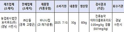 식약처 식품안전정책국은 “경남 사천시에 해당 제품을 신속히 회수 조치하도록 했다.”라며, “해당 제품을 구매한 소비자에게 섭취를 중단하고 구입처에 반품해 줄 것을 당부한다.”라고 밝혔다.