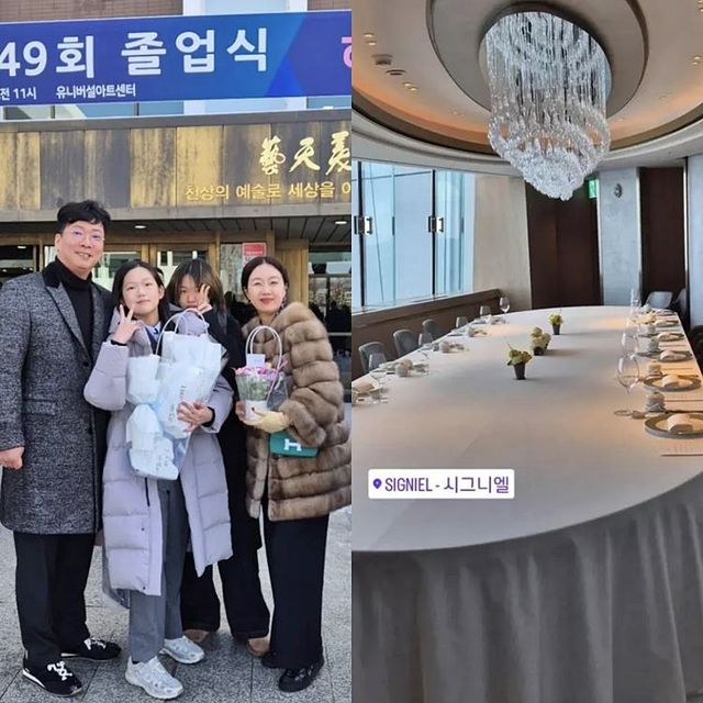 사진 속 둘째 박혜이 양은 가족들과 함께 행복한 표정을 짓고 있다. 이들 가족은 졸업식 후 서울 잠실 L 타워 위치한 시그니엘 클럽에서 졸업 파티도 했다.