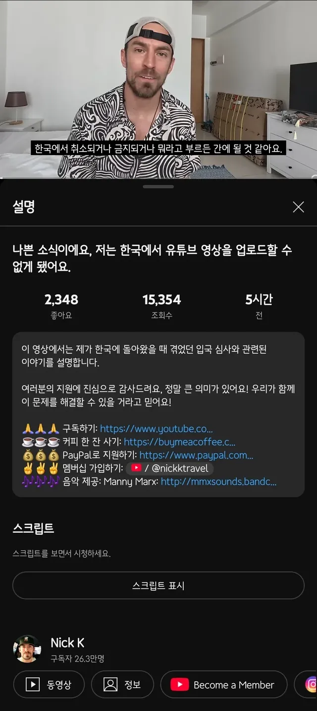여행비자로 유튜브 수익창출 활동(광고협찬 받음)을 한다고 입국금지 당한듯
