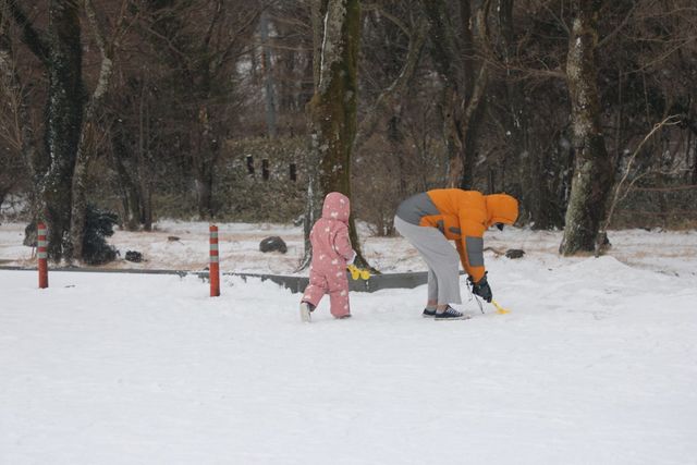 지난해 12월 28일 오후 대설주의보가 발효 중인 제주 한라산 성판악 입구에서 가족들이 눈놀이를 하고 있다. / 뉴스1