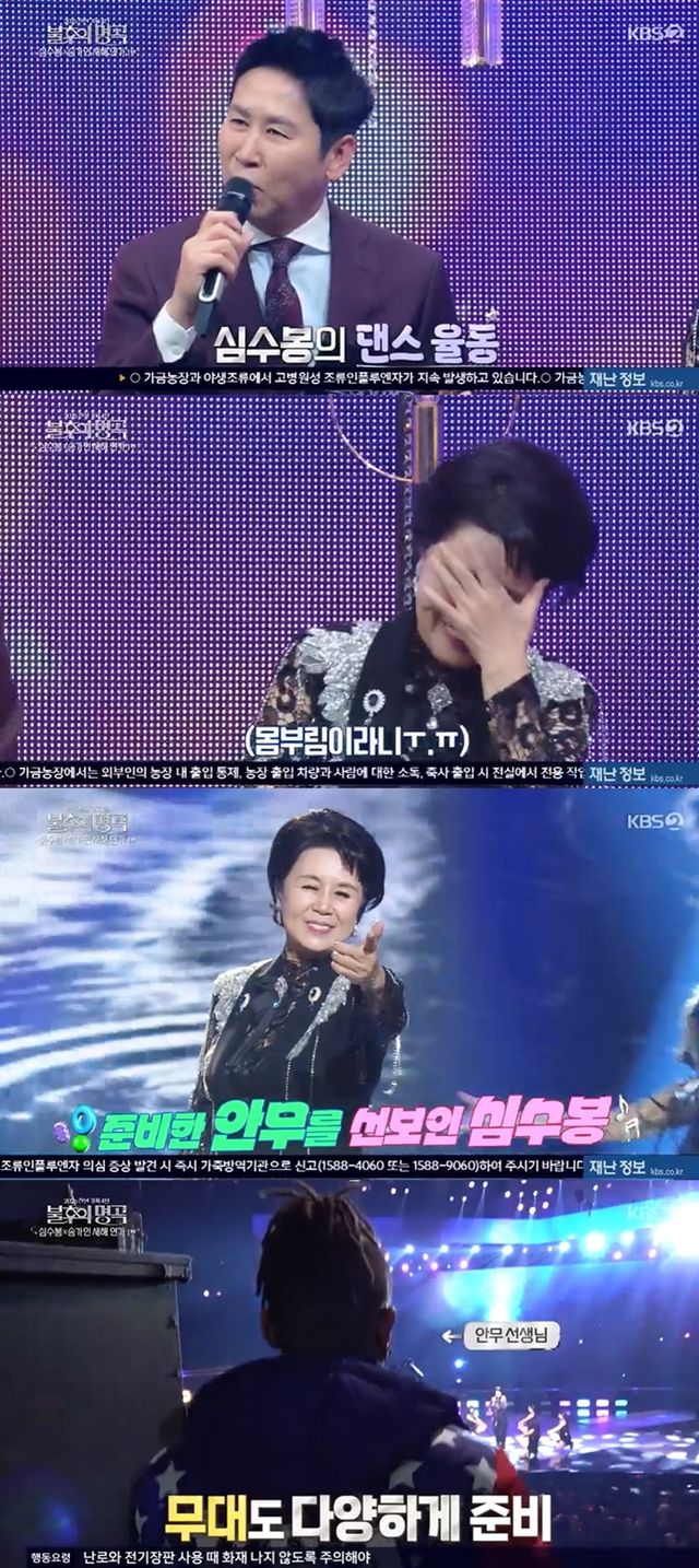 이날 신동엽은 빠른 노래에 맞춰 칼박자 동작을 선보인 심수봉에게 "오프닝 무대에 심수봉이 댄스, 율동 혹은 몸부림을. 박자가 왜 이리 빠르지?했는데 쫙(화려한 동작을) 하더라"라고 언급했다.