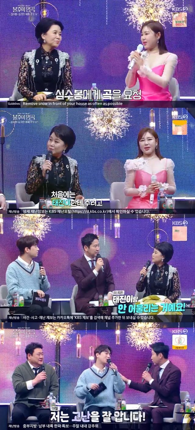 이어 심수봉은 "(태진이는) 잘 나가고 공부도 열심히 해서 고난이나 눈물을 알까 고민했다"며 "근데 곡을 줄 수 있게 마침 (송가인에게) 연락이 왔다. 태진아 욕 하지마"라고 너스레를 떨었다.