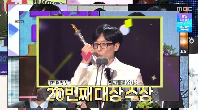 유재석은 "MBC에서 안 받았으니 조용히 해달라"고 너스레를 떨며 '20개 중 MBC 포함도 되어있지 않냐'는 말에 "MBC 8개, SBS 8개, KBS 2개, 백상 2개다. 20년 만에 20회 수상이다"라고 전했다.