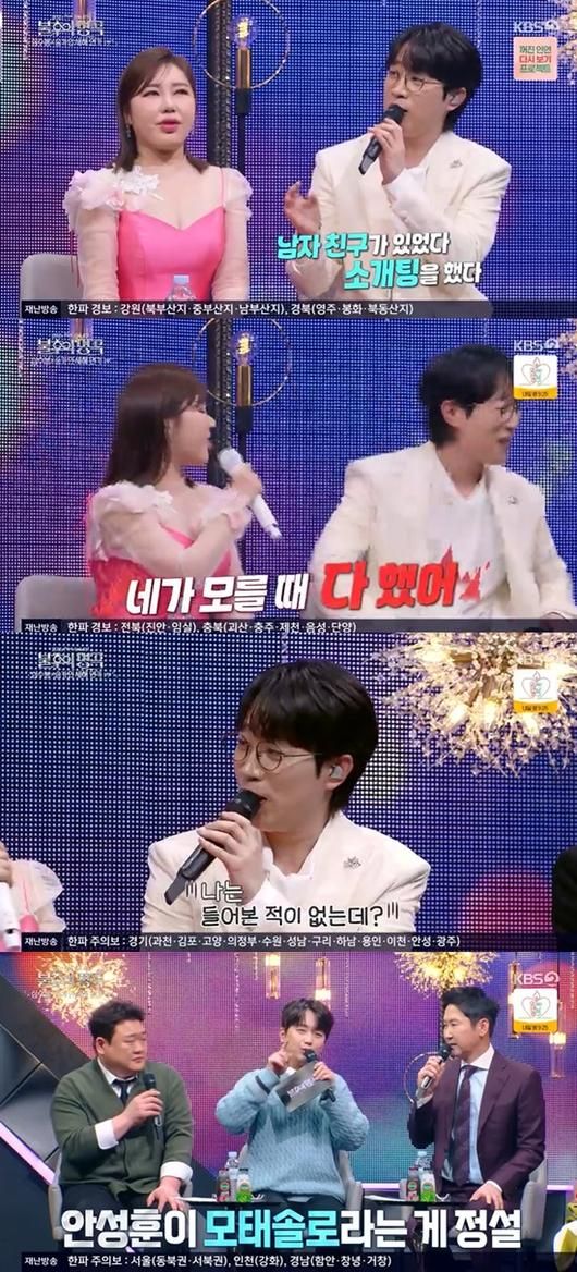 이어 송가인은 "성훈이는 거의 모태 솔로인 걸로 알고 있다"고 역공했고, 이찬원 또한 "남자 트로트 가수 사이에서 안성훈이 모태 솔로라는 건 거의 정설"이라고 덧붙여 안성훈을 당황하게 했다.