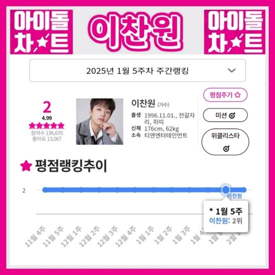 아이돌차트는 최근 이찬원이 2025년 1월 5주 차 평점 랭킹에서 136,670표를 받아 2위를 차지했다고 밝혔다.