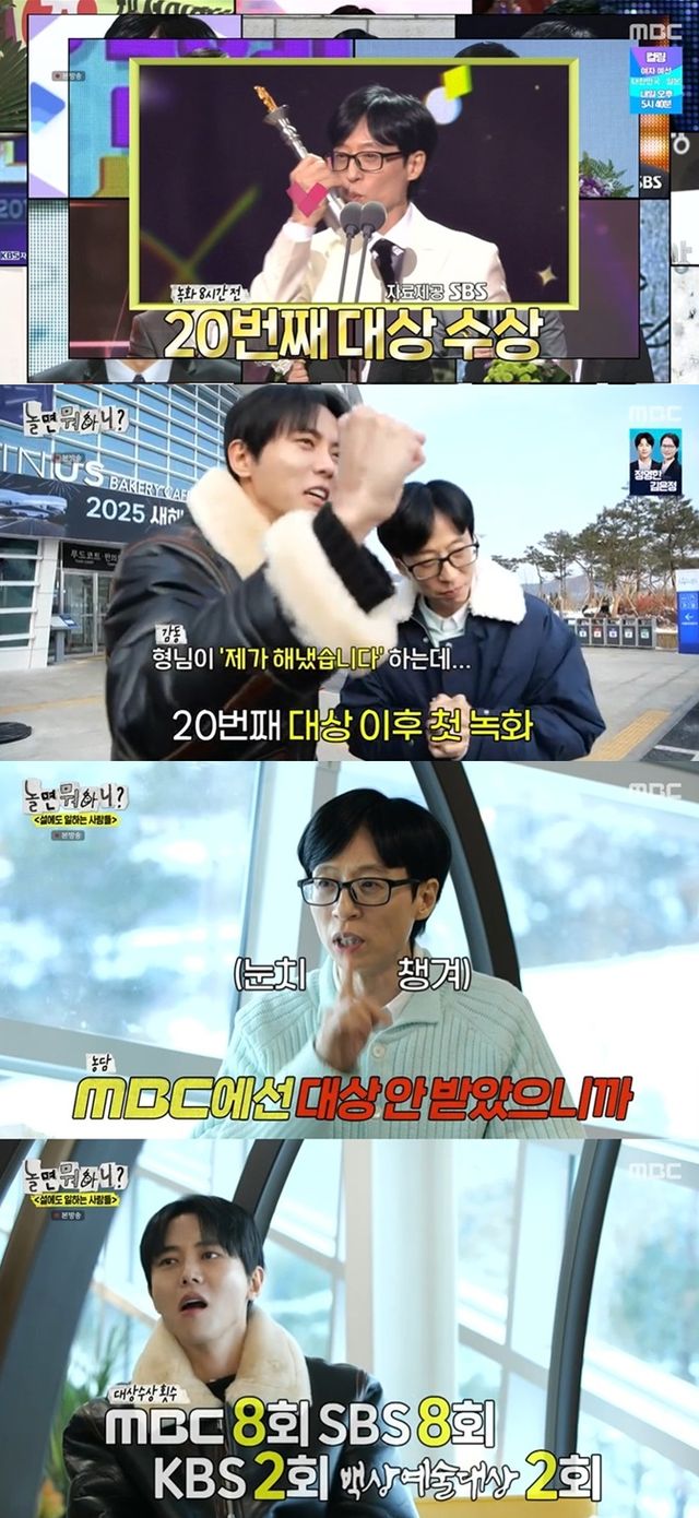 유재석은 20번째 대상 소감을 묻는 주우재에게 "MBC에서 안 받았으니 조용히 해달라"고 짚다가도 '20개 중 MBC 포함도 되어있지 않냐'는 말에 "MBC 8개, SBS 8개, KBS 2개, 백상 2개다. 20년 만에 20회 수상이다"라고 설명했다.