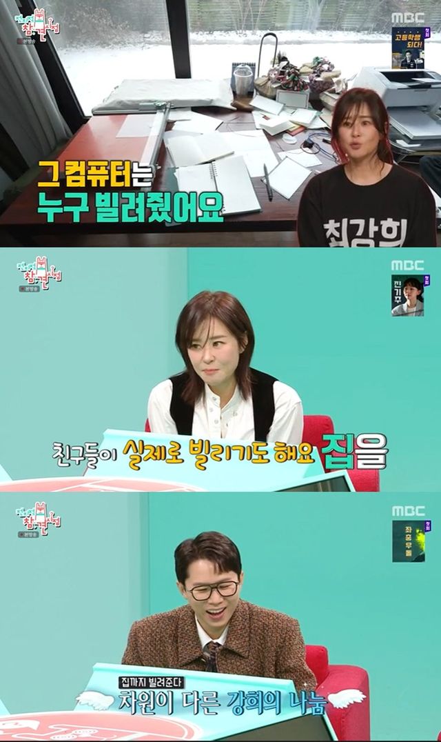 요거트를 먹기 위해 앉은 테이블 위에는 이전에 있던 컴퓨터가 사라져 있었고, 최강희는 "컴퓨터는 누구 빌려줬다"고 말하며 여전히 아나바다를 열심히 실천 중임을 알렸다. 그러면서 "친구들이 실제로 며칠씩 집을 빌리기도 한다"고 말했다. 이에 이영자는 "그럼 어디서 자냐"고 물었고, 최강희는 "본집 가서 잔다"고 말해 모두를 놀라게 했다.
