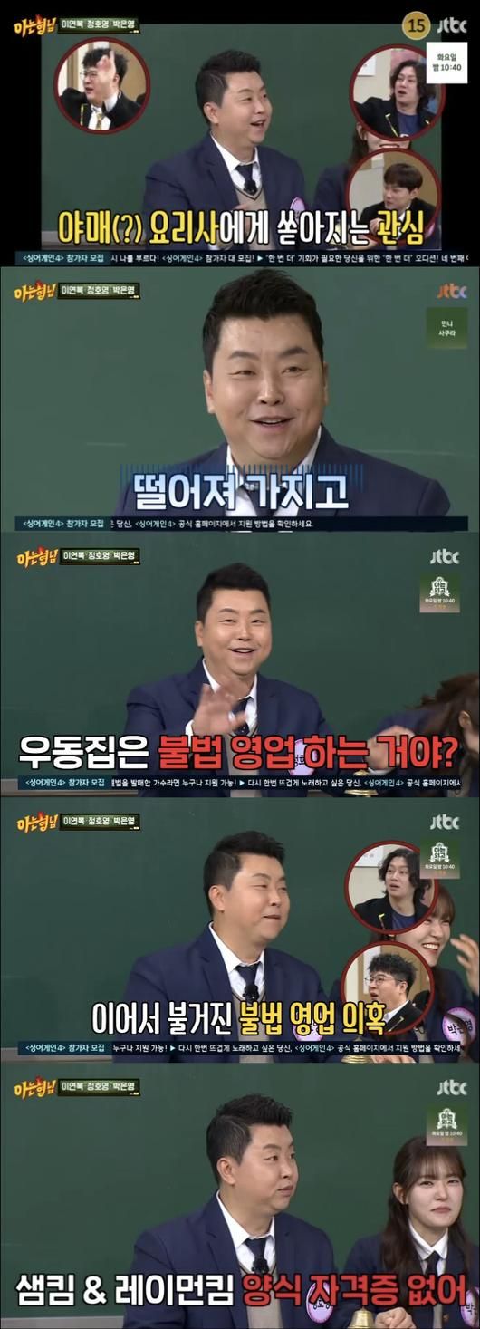 이수근은 "우동집은 불법 영업하는 거냐"는 가짜 뉴스를 퍼뜨렸지만, 이연복은 "자격증 없어도 매장은 관계없다. 자격증 없는 셰프들 의외로 많다"고 해명했다. 정호영 역시 "샘킴, 레이먼킴 양식 자격증 없다"고 폭로전을 시작했고, 김희철의 타박에 "같이 죽어야지"라고 응수해 웃음을 자아냈다.
