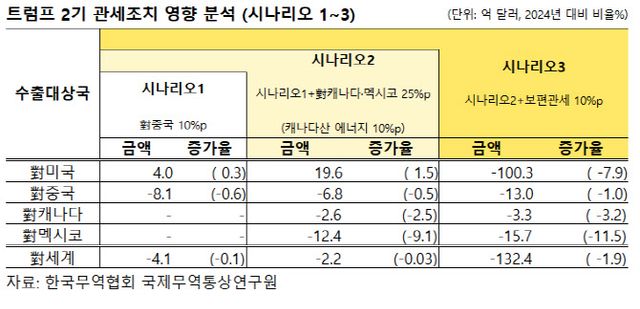 한국무역협회 국제무역통상연구원은 9일 발표한 ‘트럼프 2기 행정부 관세조치에 따른 영향 분석’ 보고서를 통해 미국의 관세부과 시나리오별 우리 수출에 미치는 영향을 분석했다. 시나리오는 △대(對) 중국 10%포인트(p) 추가 관세부과(시나리오1) △시나리오1+대 캐나다·멕시코 25%p 관세부과(시나리오2) △시나리오2+보편관세 10%p 부과(시나리오3) 총 3단계로 구성됐다.