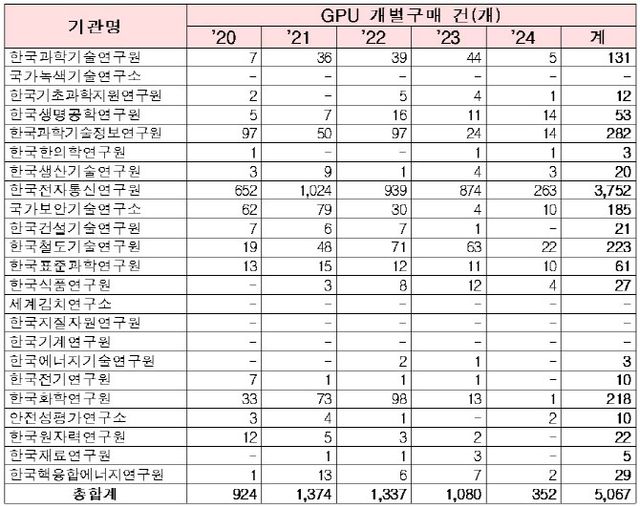 기관별로는 △한국과학기술연구원(44건→5건) △한국전자통신연구원(874건→263건) △한국철도기술연구원(63건→22건) △한국식품연구원(12건→4건) △한국화학연구원(13건→1건) 등으로 지난해 구매 건수가 전년 대비 확연히 줄었다. 한국에너지기술연구원, 한국전기연구원, 한국원자력연구원 등은 이전 년도에 GPU 구매 사례가 있었지만 지난해에는 전혀 구매를 하지 못한 것으로 나타났다.