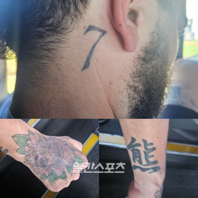 그러던 중 오른팔 바깥 쪽에 적힌 한자 문신이 눈에 들어왔다. '일본에서 새긴 문신인가'라는 기자의 질문에 그는 "일본에서 내 별명이 곰이었다. 곰을 뜻하는 한자를 새겼다"라고 답했다. 이어 손등에는 '힘'을 상징하는 '보라색 꽃'을, 전완근에는 일본의 사무라이 미야모토 무사시 문신을 일본에서 새겼다고 덧붙였다. 오른쪽 귀 밑에 새긴 숫자 '7'도 의미가 있었다. 일본프로야구에서 '7번째' 노히트 노런 기록을 세운 기념이라고 전했다.