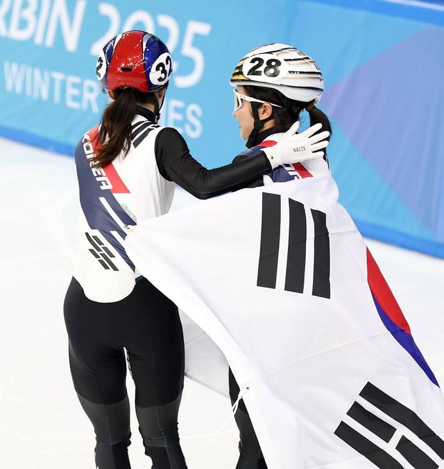 지난 8일(현지시간) 중국 헤이룽장성 하얼빈 빙상훈련센터 다목적홀에서 열린 하얼빈 동계아시안게임 쇼트트랙 여자 1,500m 결승에서 최민정이 우승한 김길리의 등을 토닥이고 있다 / 뉴스1