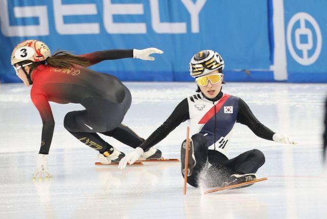 9일(현지시간) 중국 헤이룽장성 하얼빈 빙상훈련센터 다목적홀에서 열린 하얼빈 동계아시안게임 여자 쇼트트랙 3,000m 계주 결승에서 대한민국 김길리가 넘어지고 있다. 김건희, 김길리, 이소연, 최민정이 나선 대표팀은 4위를 차지했다 / 뉴스1
