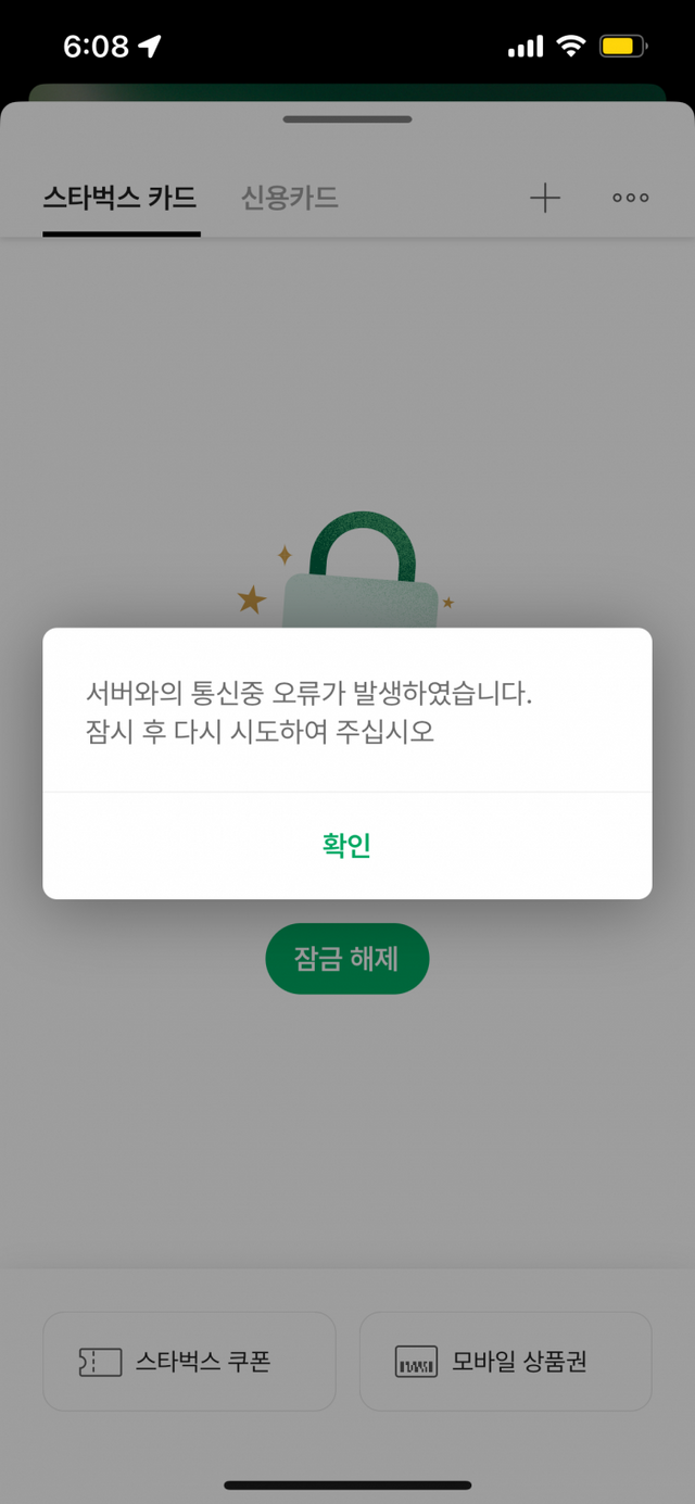 현재 스타벅스 어플을 이용해 결제 요청 시에는 '서버와의 통신중 오류가 발생하였습니다. 잠시 후 다시 시도하여 주십시오'라는 문구가 뜬다.