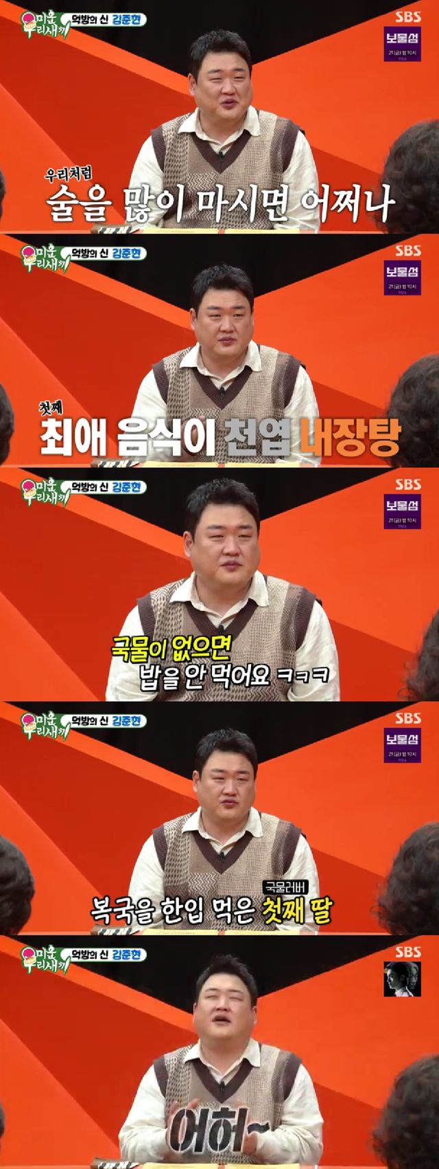 이어 김준현은 "첫째가 천엽 좋아하고, 내장탕도 좋아한다. 국물이 없으면 밥을 안 먹는다. 북국을 한입 먹더니 초등학교 3학년짜리가 '어허~'해서 '술꾼이 되겠구나' 생각했다"고 전했다.