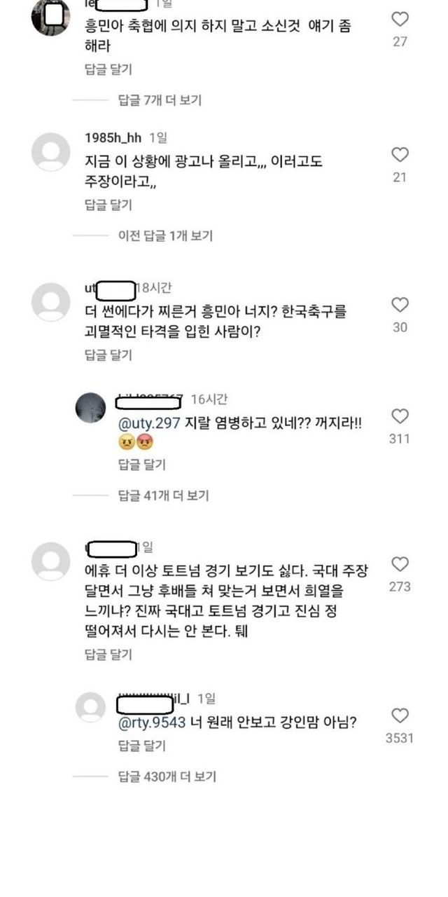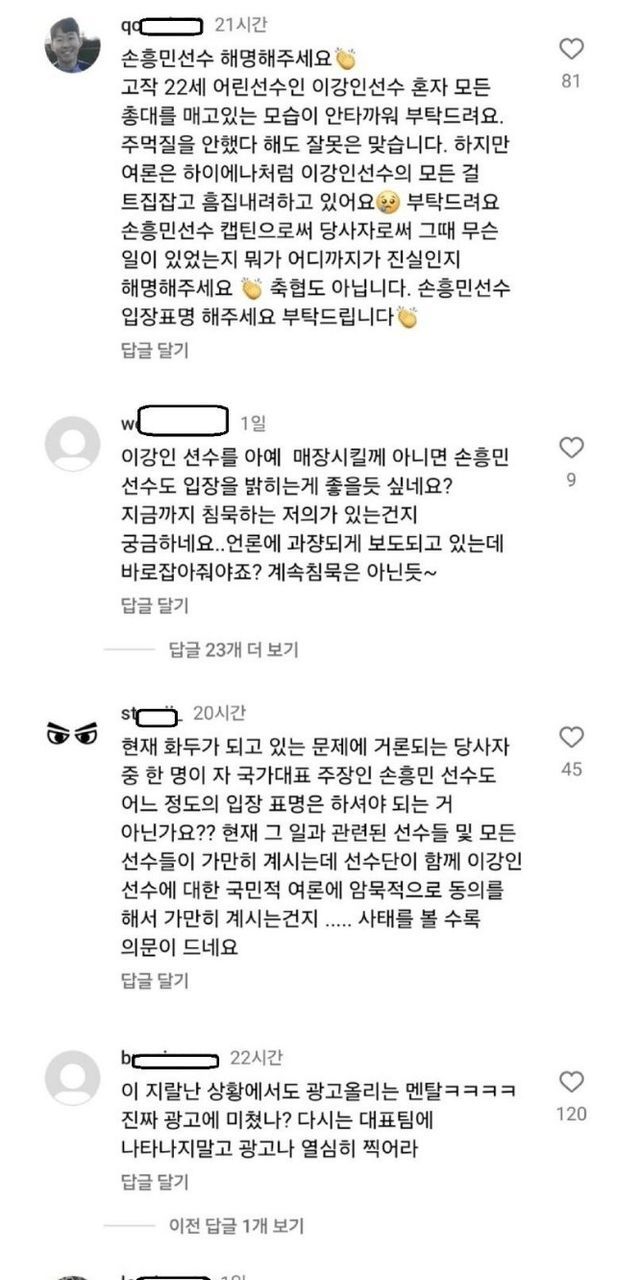 댓글 개판된 손흥민 인스타 상황 ㄷㄷ