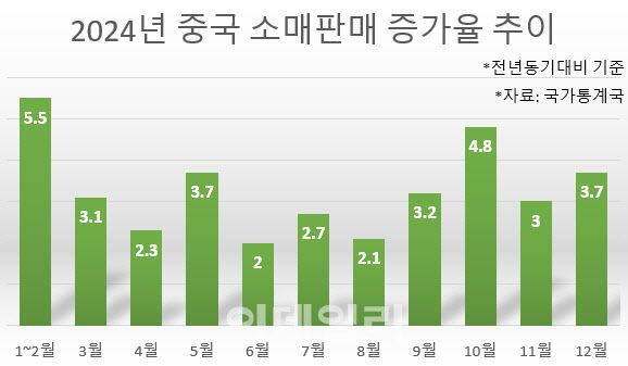 지난해 춘절 연휴가 포함된 1~2월 중국의 소매판매는 전년동기대비 5.5% 증가했다. 이후 3월부터 12월까지와 비교하면 연중 최고 증가폭이다.