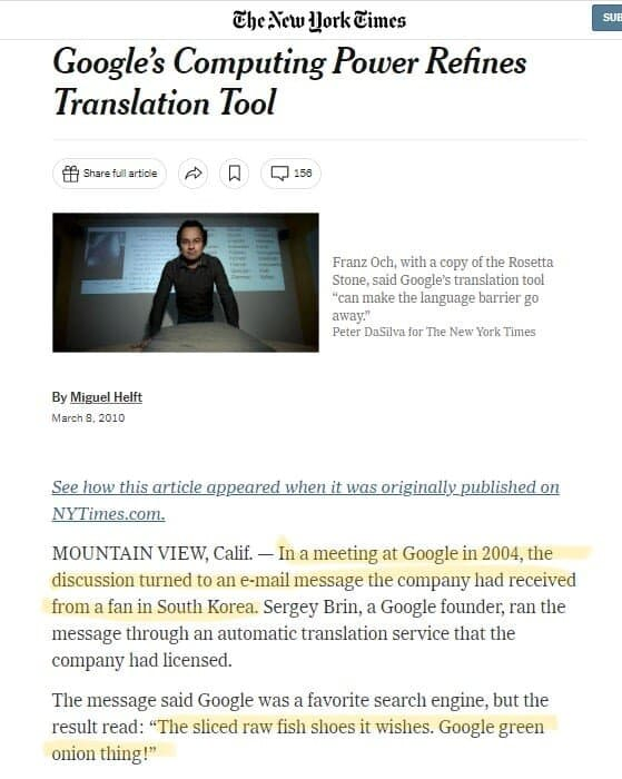 회(The sliced raw fish) 신(Shoes) 바랍니다.(It wishes.) 구글(Google) 파(Green onion) 이팅!(Thing!)으로 번역된 것에 충격먹고
